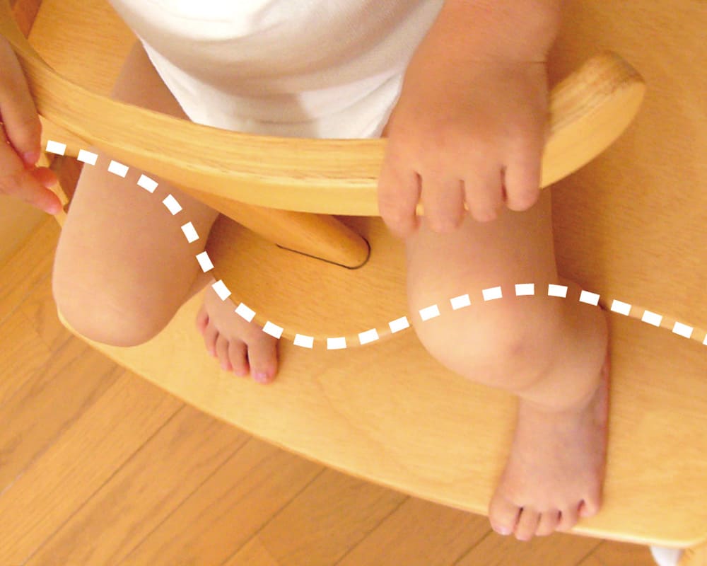 そして、すくすくチェアといえば「いい姿勢で座れる」「いつも足がついた状態で座れる」ことが大きな特長です。そのために、子どもの膝が自然に曲がるよう配慮した波型形状の座板を開発しました。