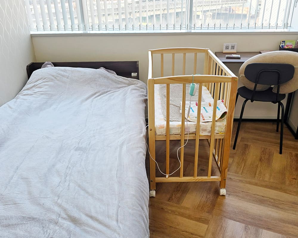 個室も、そんなに広いわけではないので、ここに一般的なベビーベッドを置いてしまうと圧迫感があるんですが、リビングコットだと軽くてコンパクトなので可動もしやすいですよ。