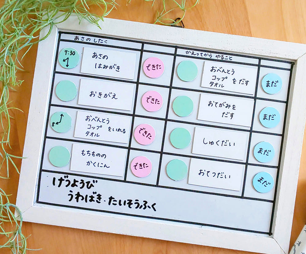 「次は着替え、その次はご飯!」と、言葉での指示するよりも、写真やイラストのカードを並べたり、いわゆる「おしたくボード」を用意してみてください。