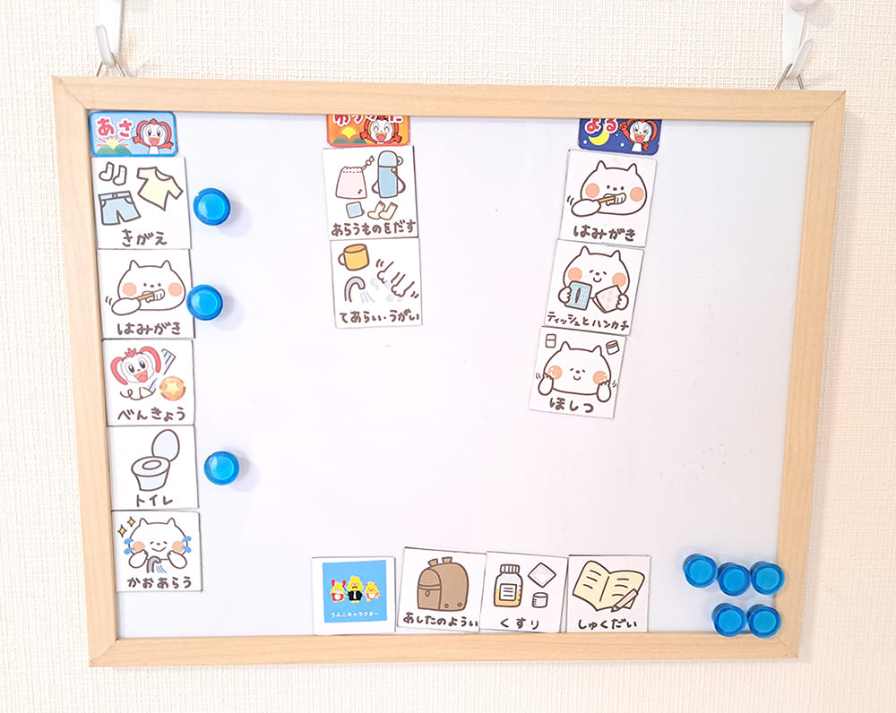 「次は着替え、その次はご飯!」と、言葉での指示するよりも、写真やイラストのカードを並べたり、いわゆる「おしたくボード」を用意してみてください。